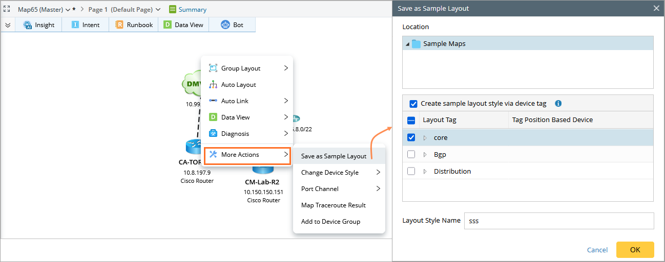 Use this feature to save the current layout of a map as a sample. You can save it based on device positions or layout tags. This makes it easy to reuse the layout for similar maps in the future.