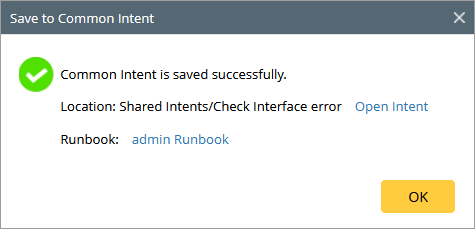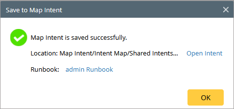 - Click OK. A message will appear after successfully saving the intent. You can click Open Intent in the message box to view the intent details.