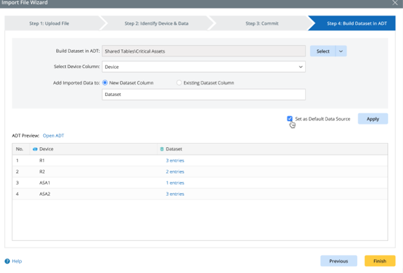 To use the dataset as default data source, in step 4 of Import File Wizard (for more information, see Build Dataset for ADT), check the checkbox "Set as Default Data Source".
