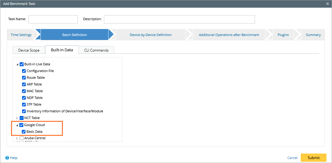 Note: As a best practice, we recommend re-using the Basic System Benchmark with a full benchmark task, where all devices are selected. This ensures that all GCP-connected physical or virtual devices are selected within the device scope.