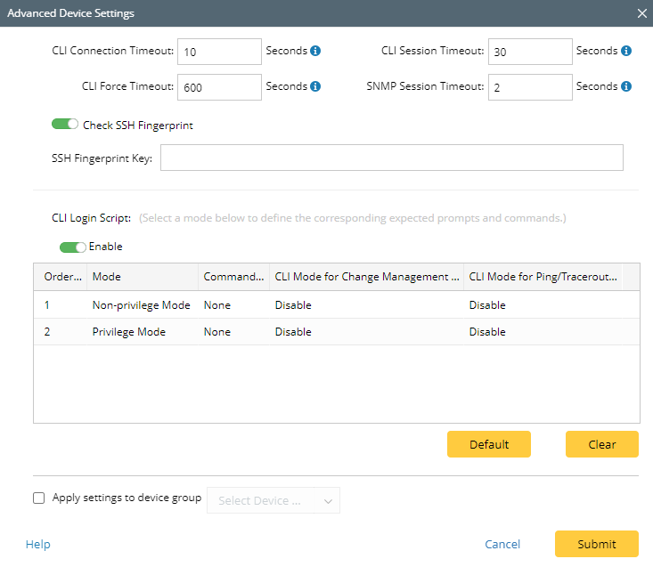 - Advanced Settings — set more details for CLI device access, such as the CLI connection timeout, SSH fingerprint key, way of creating CLI login script.