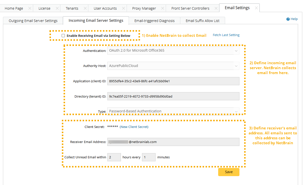 In the Email Settings > Incoming Email Server Settings tab in System Management, you can set up the receiver's Email address for the NetBrain System:
