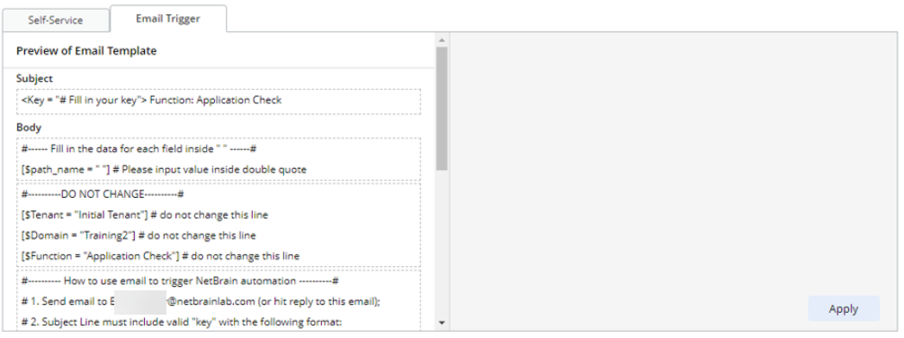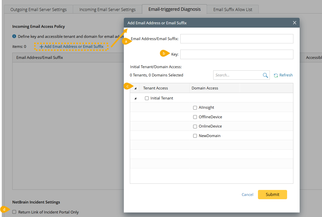 In the Email-triggered Diagnosis tab, you can add an Email Address or Email Suffix to define the allowed Email address for NetBrain. Three components need to be defined for each Email address: