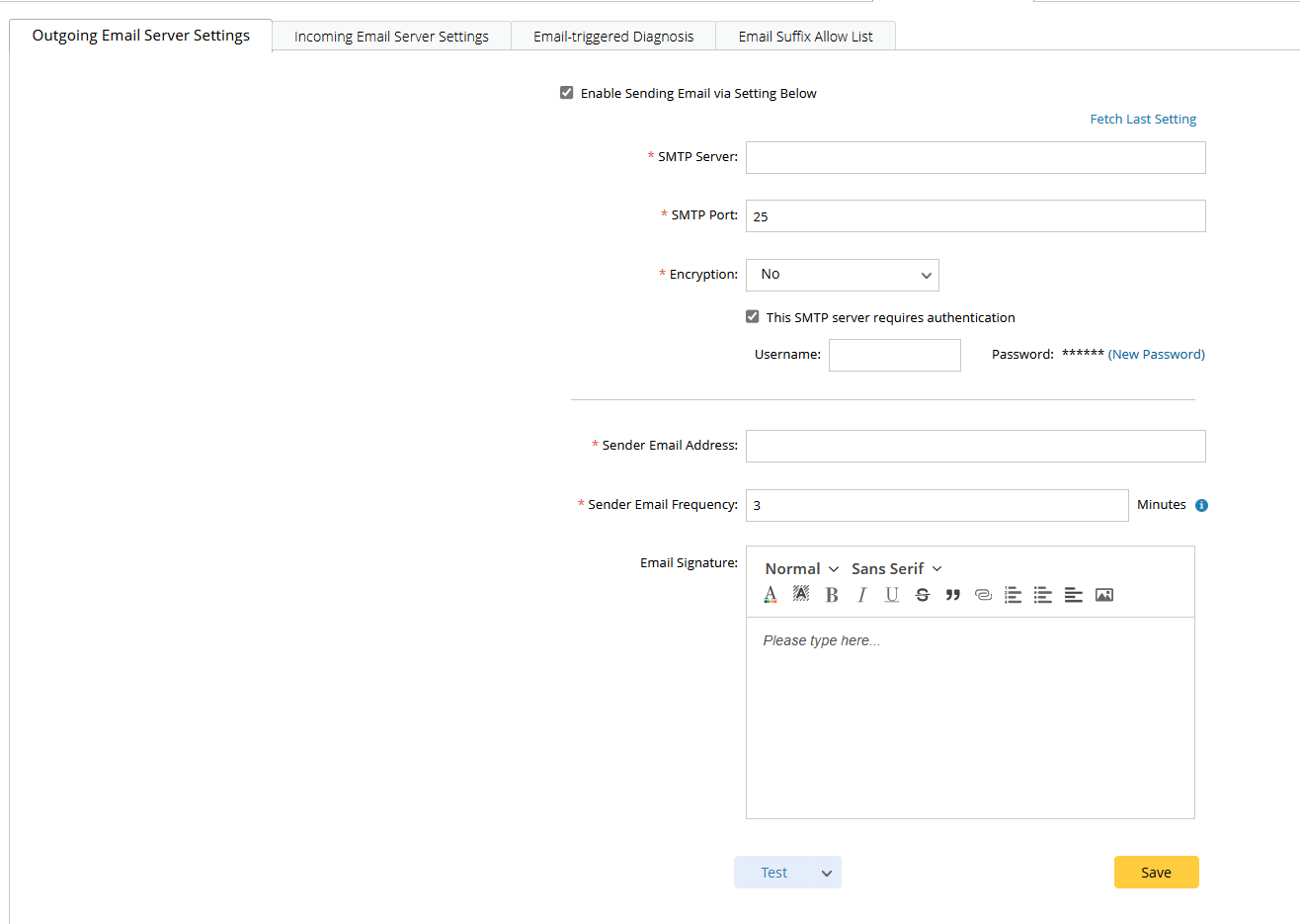 In the Outgoing Email Server Settings tab, you can define the outgoing Email server settings such as Email address, password, and SMTP port.
