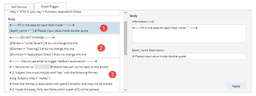 - Click each block of the email body and define the descriptions. Click Apply when one block is finished.
