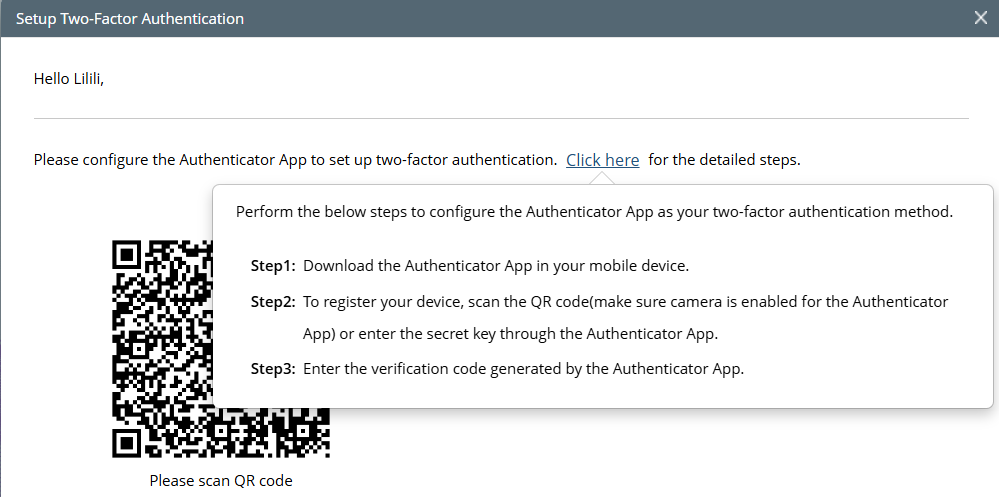 Note: Click the "Click here" link, then a brief guide is provided for setup two-factor authentication with Authenticator App.