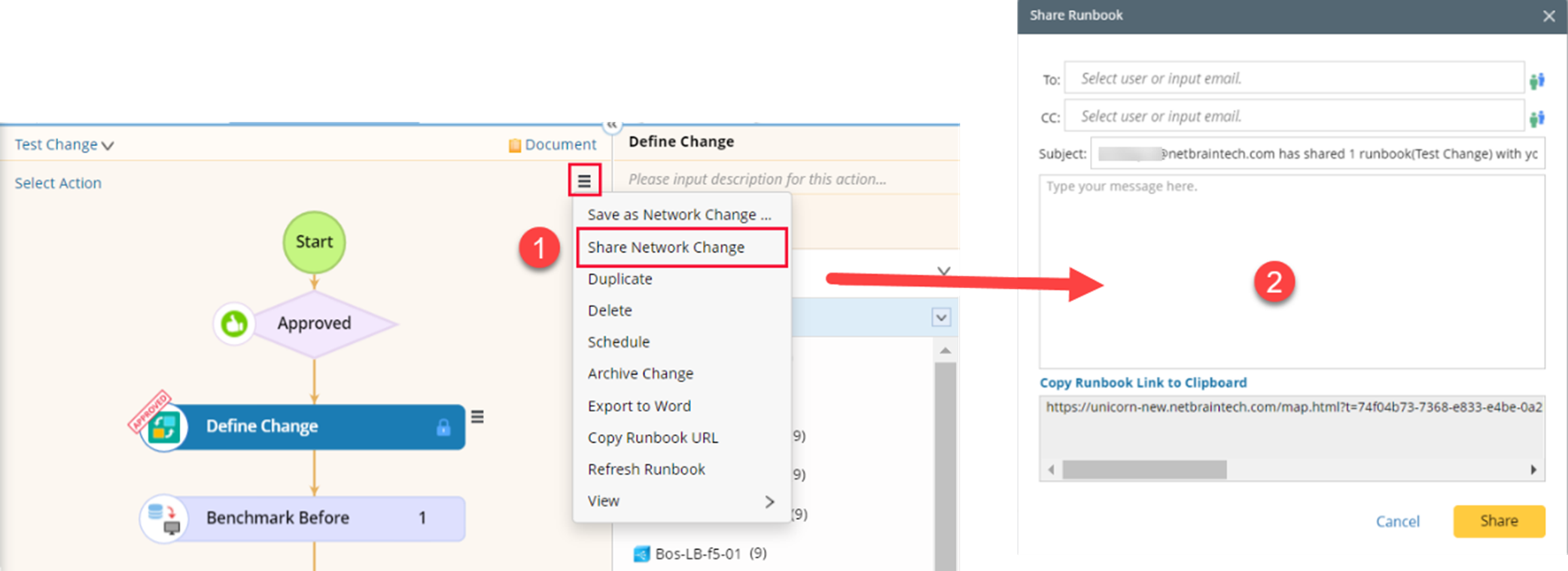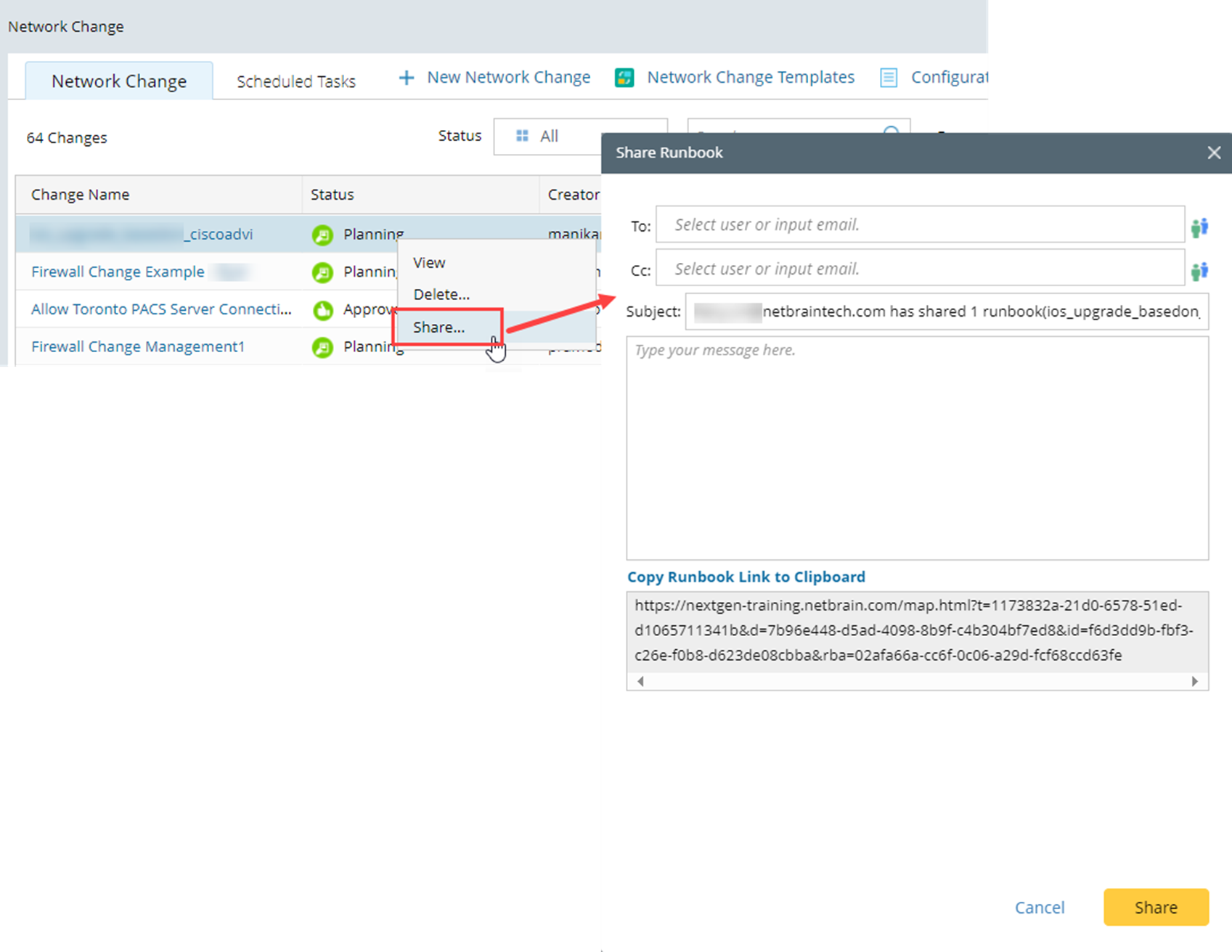 Tip: you can also share a Network Change task from Network Change pane. Right-click the task you want to share, and then click Share from the drop-down menu.
