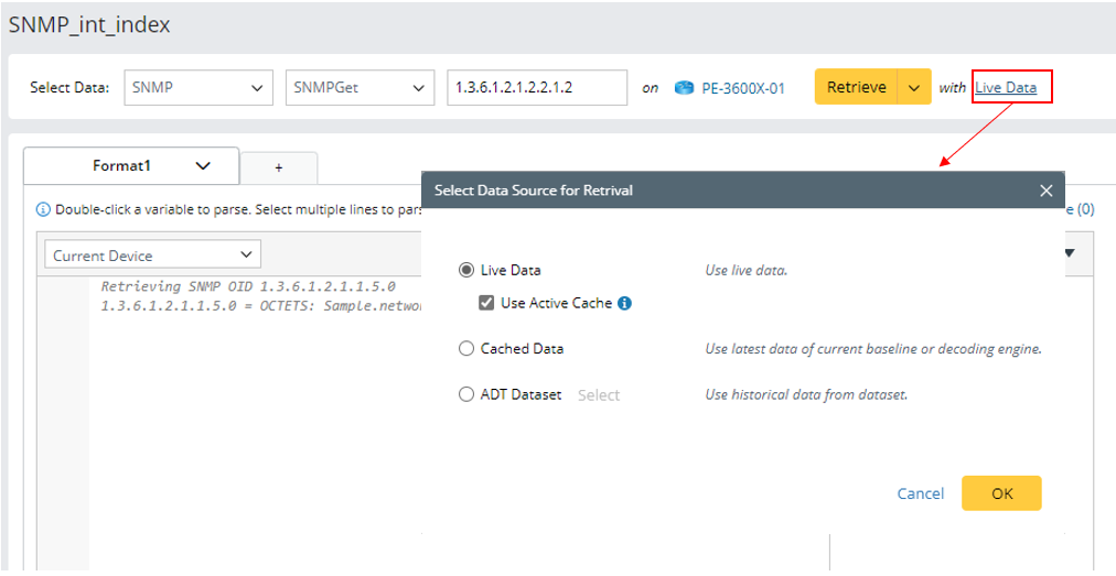 - Retrieve data: Click Live Data and select the data source for retrieving data. then click Retrieve. The SNMP sample data will be added to the Sample Text input pane.