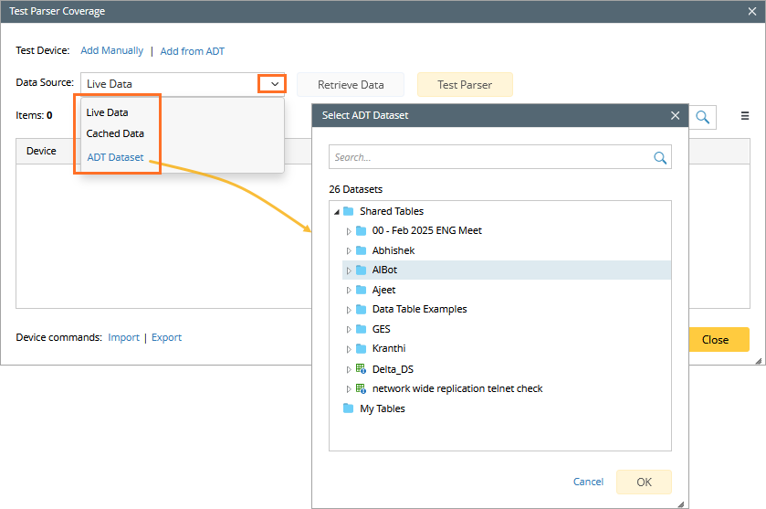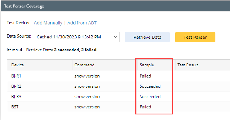 Tip: The Cached Data, ADT Dataset, and Cached Data(from live retrieval) enable users to retrieve data from selected testing devices once, but test the parser multiple times after each parser modification for debugging, without reduplicative live retrieval.
