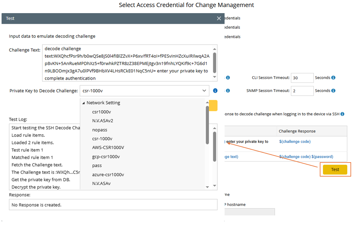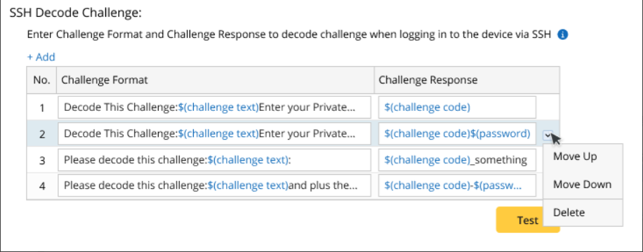 - Challenge Response: The challenge response specifies the response format. For instance, $(challenge code) returns only the challenge text to the device, whereas $(challenge code)$(password) returns both the challenge text and the password for authentication.