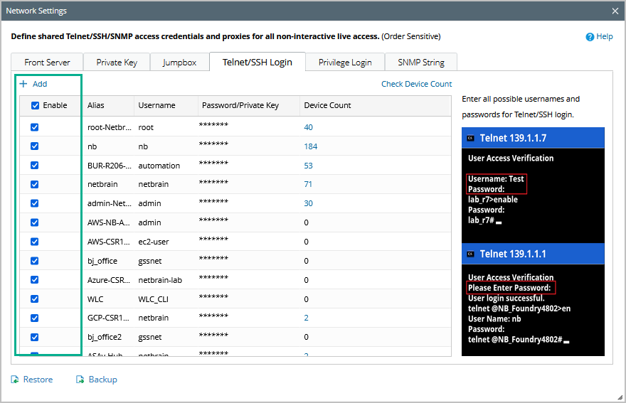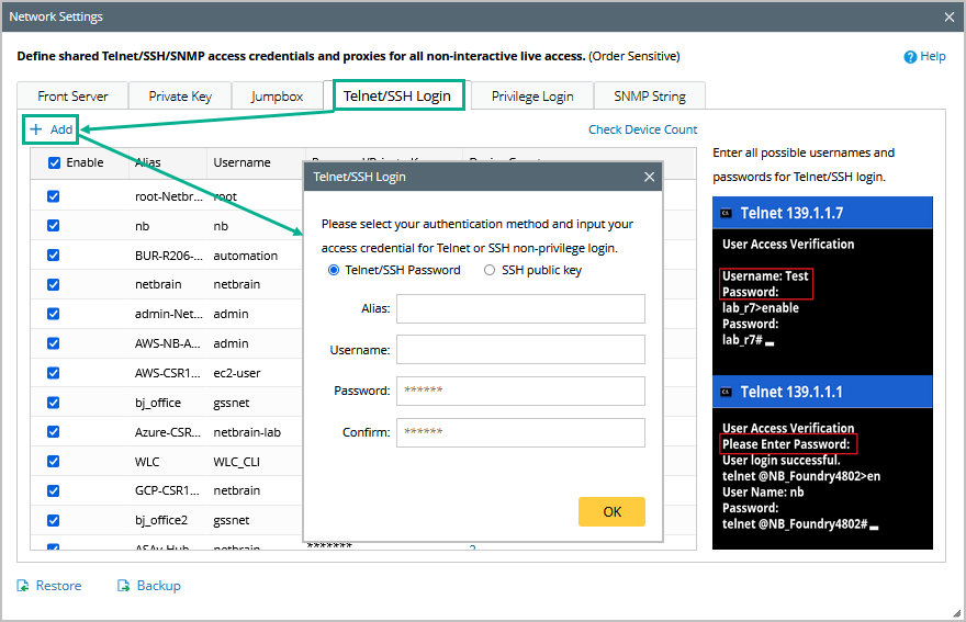 1) Click Telnet/SSH Login > Add to add the matched Telnet/SSH login credentials and click OK. Repeat the operations to add all the needed credentials.