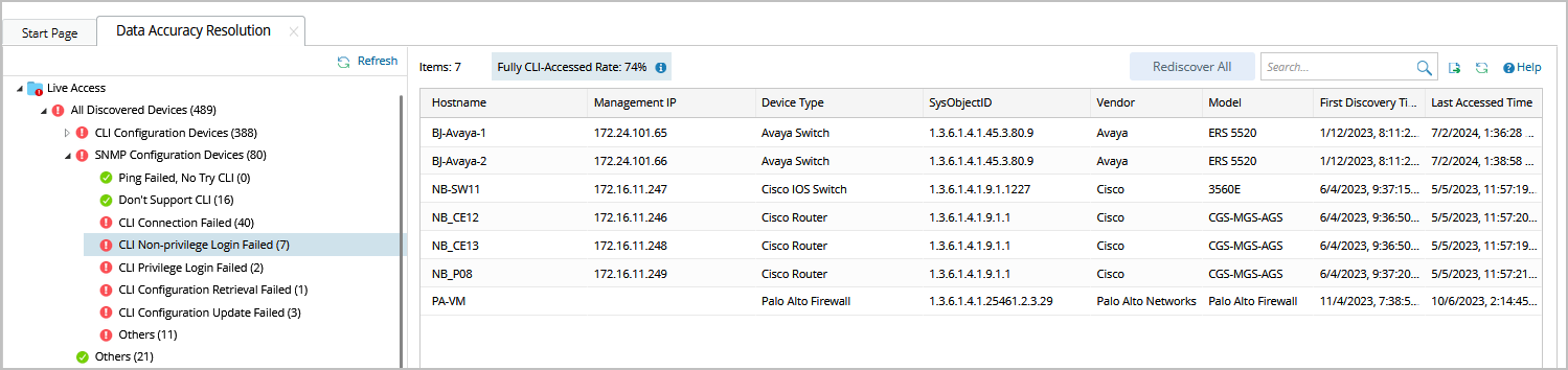- On the Data Accuracy Resolution tab, click CLI Non-privilege Login Failed under SNMP Configuration Devices in the left pane. All IP addresses with mismatched SSH/Telnet login credentials are displayed.
