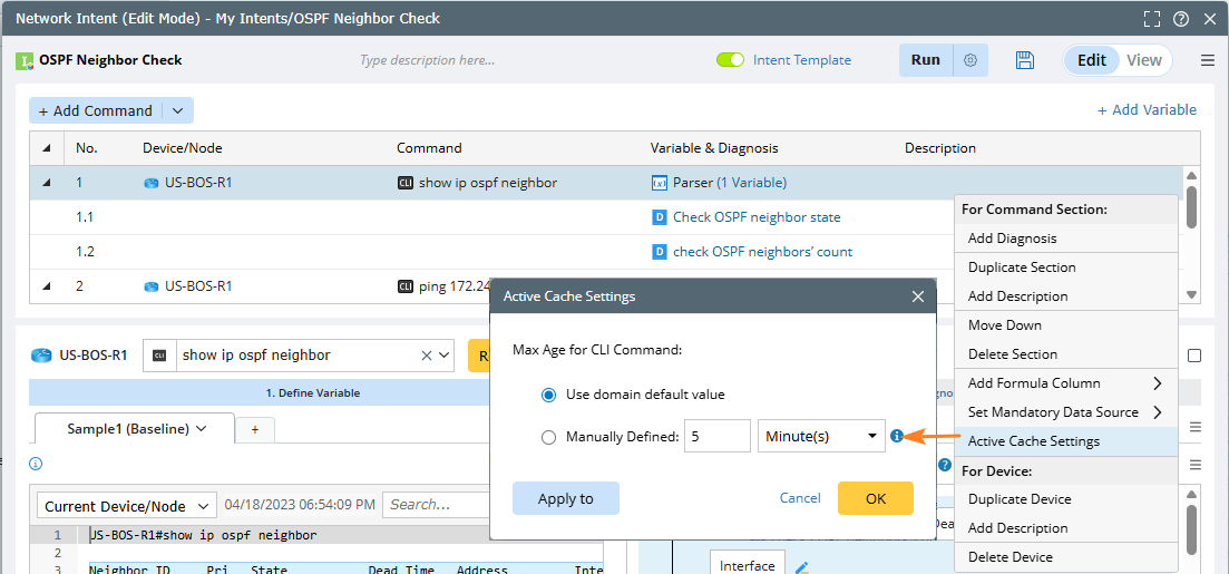 Use Active Cache aims to safeguard network devices against excessive Telnet/SSH requests. This option is available for the Live Data data source setting in network intent execution/replication/decoding. Essentially, it ensures that live data retrieval from devices occurs only when cache data is unavailable or outdated. Furthermore, all live retrieved data is added/updated into a global Active Cache for future live data requests.