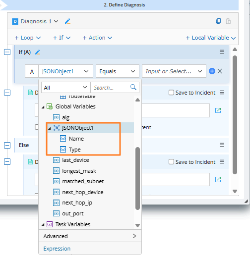 You can add a native object type Node in the intent. Its specified properties will appear in the variable tree, enabling you to select them for diagnosis definitions.