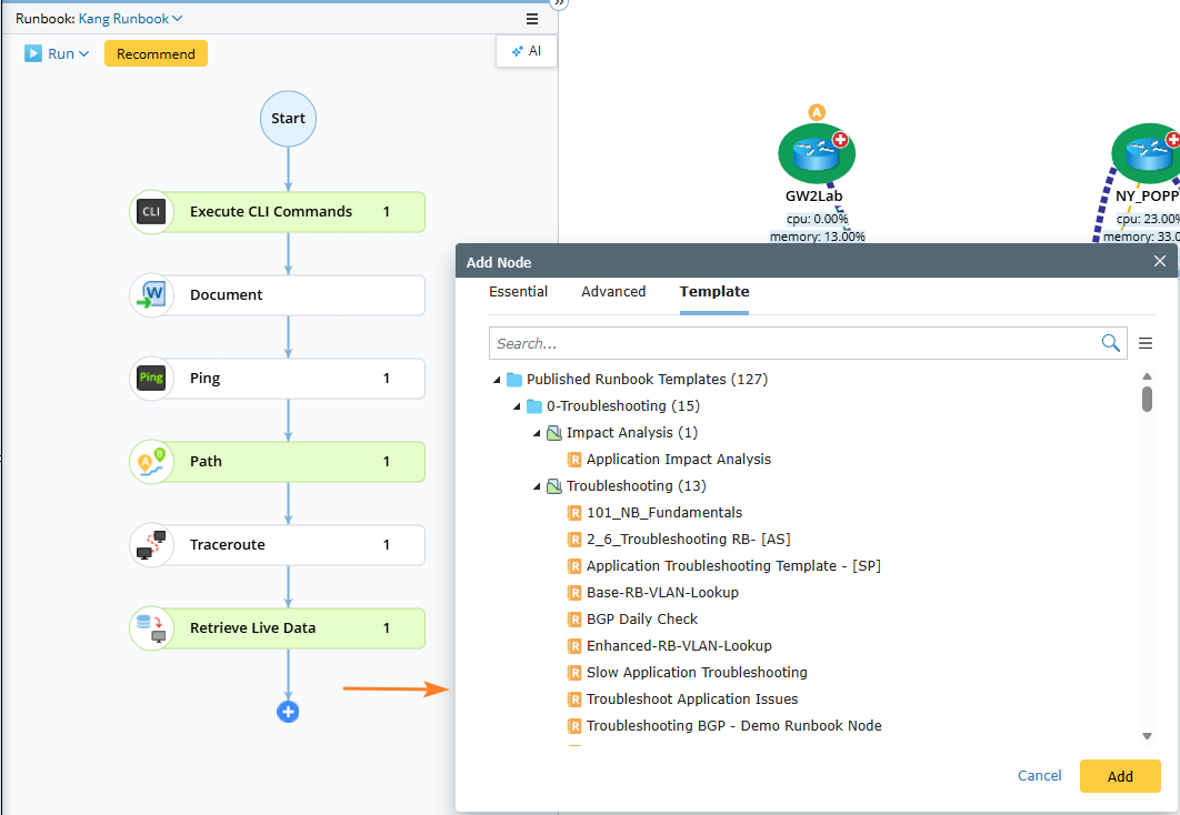 Add a runbook template to a runbook in the recommended automation with the data view template, decision tree, and network intent: