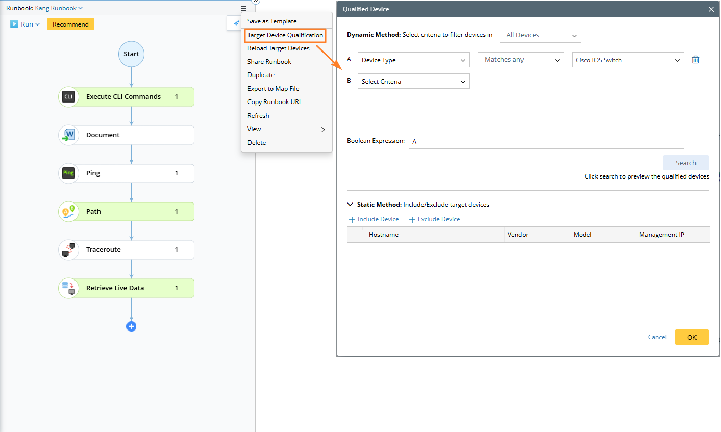 icon and select Target Device Qualification to refine devices for the Runbook.