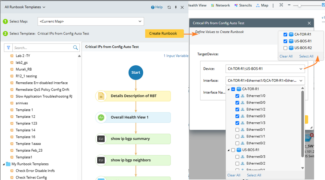 When creating a Runbook from an RBT, the UI for selecting table variables in the input dialog dynamically filters options based on dependencies.