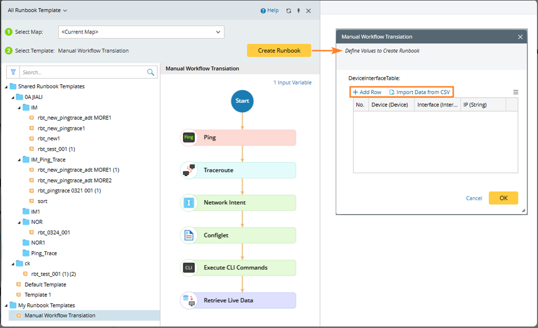 When creating a runbook, you can add rows and enter the values, or directly import the data from a CSV file.