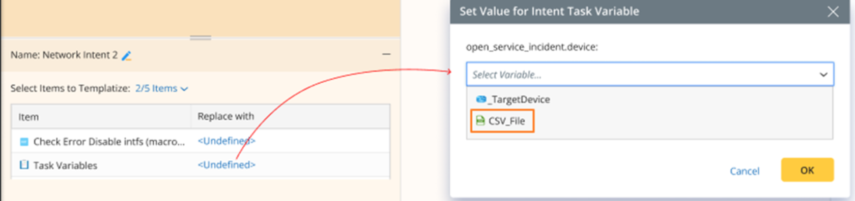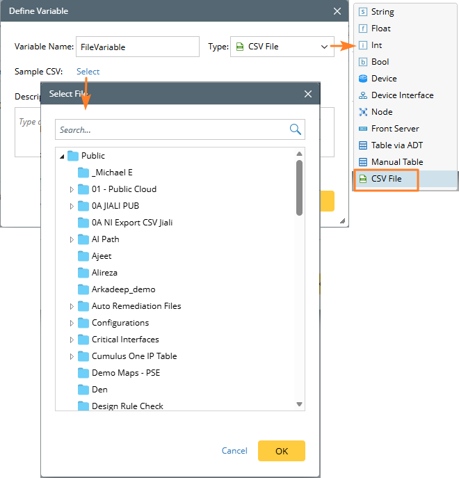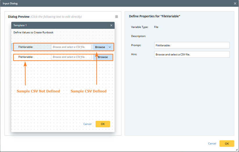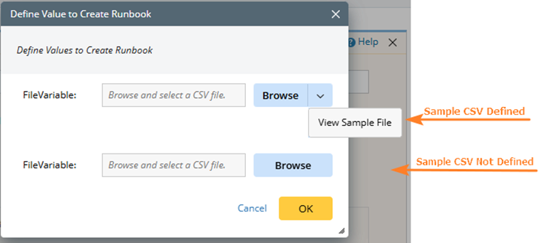 CSV File: This method allows you to pass the CSV data to a runbook intent node using a file path as a string. Selecting a CSV file as a sample CSV is optional.