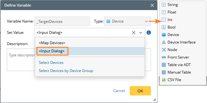 Set Values: Select candidate values from ADT columns or define dependencies using device/interface properties. The rules here are consistent with defining candidate values in the input dialog.