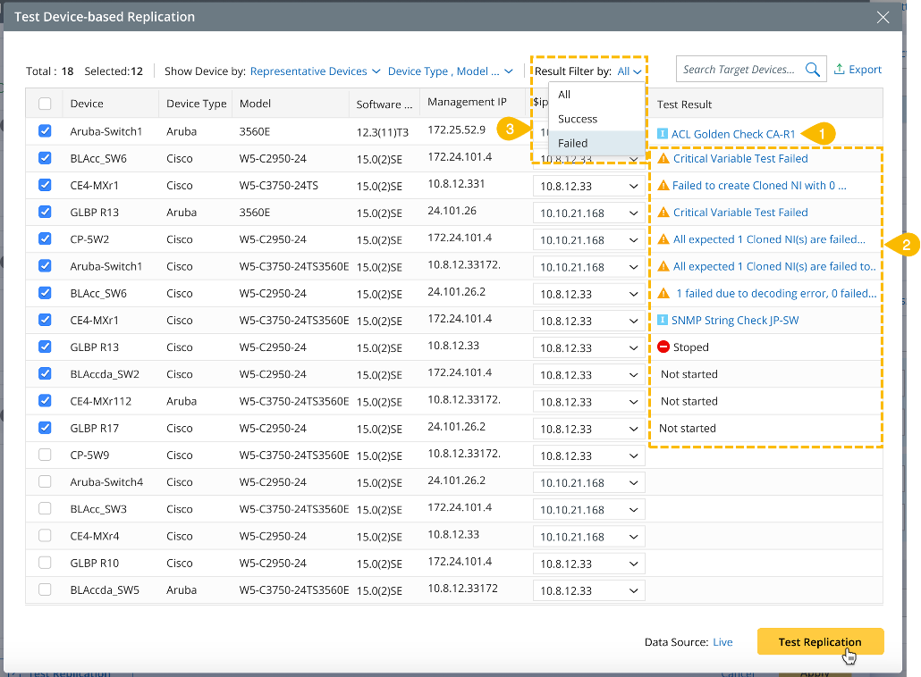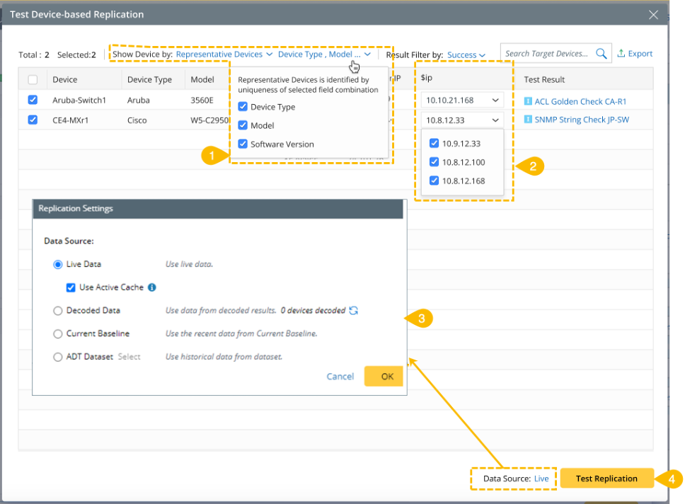 The Test Replication functionality in the replication settings allows you to select a batch of devices and perform test operations. It can be used to evaluate the matching probability of devices, including Device-Based Tests and Path-Based Tests, as follows: