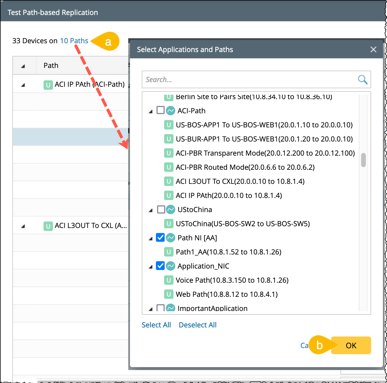- Click the Selected Applications and Paths hyperlink located at the top-left corner of the Test Path-based Replication window.