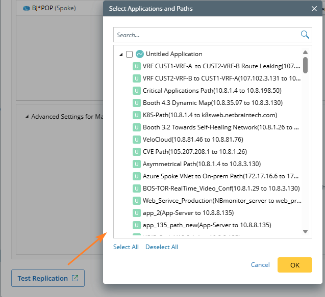 - Click Test Replication. The Select Applications and Paths window will appear.