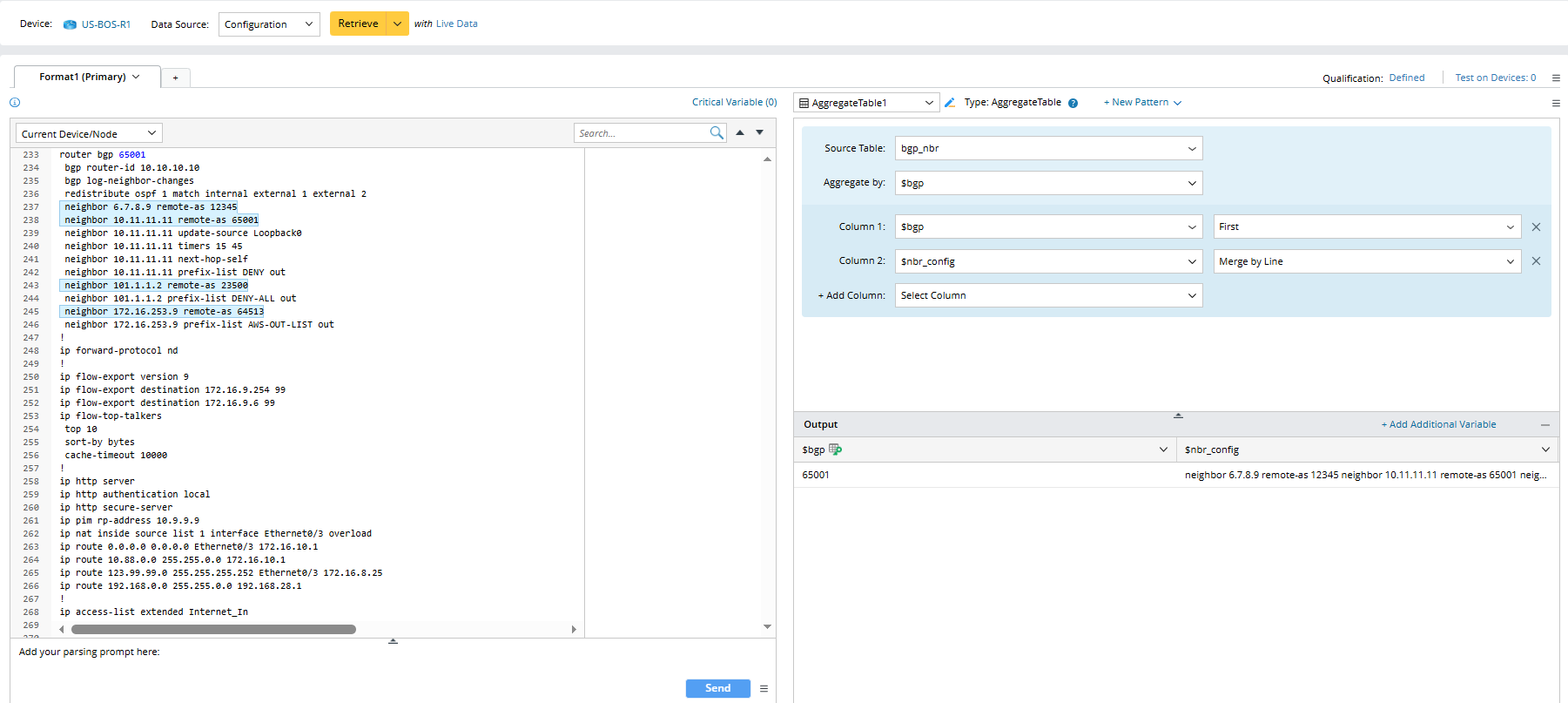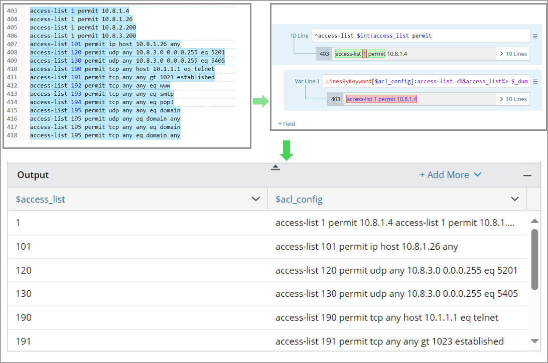 In the Merge Table pattern, you can merge the table variables from two parser output tables by paired keys, enabling the combination of configlets from different paragraphs as well.