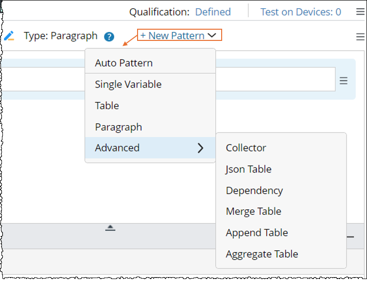 The system allows you to define the following types of Parsers to parse the variables. For each type of Parser, a set of rules work together to define how variables are extracted from Sample data text. With valid rules, the output of the Parser will be highlighted instantly inside the input text. You can select a parser pattern from the + New Pattern menu.