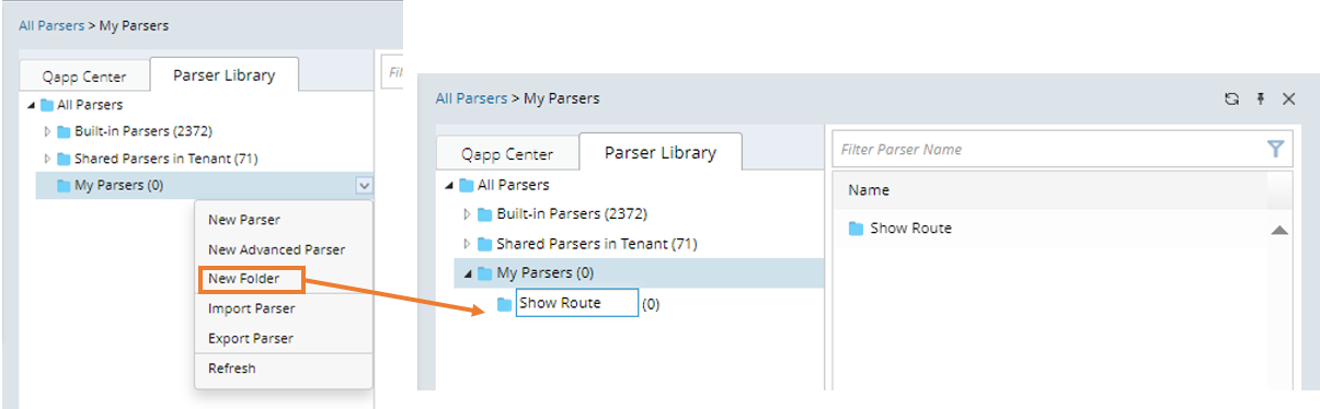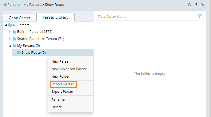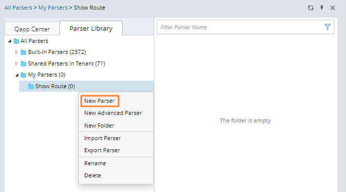 - Right-click My Parsers, then select New Folder and type the folder name (for example, Show Route).