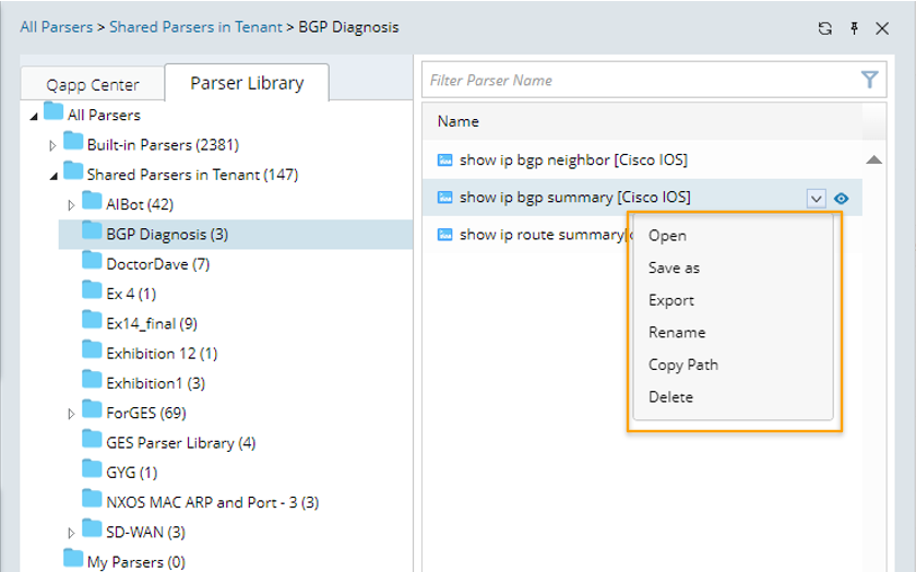 - Select a specific Parser and perform basic operations from the parser right-click menu, including opening, saving as a new parser, exporting, renaming, deleting, or copying the parser path.