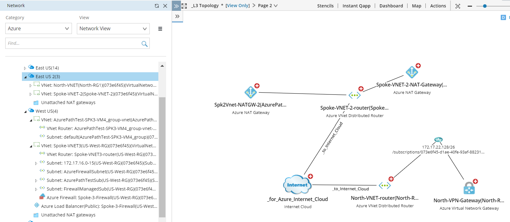 - In the Network pane, select Azure > Network View. The hierarchy view of the Azure data model is organized in this order: Tenant > Subscription > Region > VNet.