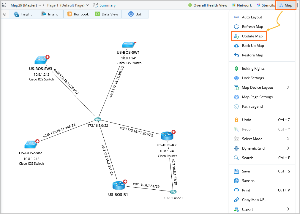 - Map Layout (applies only to site and device group maps): Updates the positions of devices on the map to reflect layout changes.