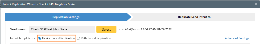 Prerequisites: You must configure the selected seed intent as a device-based intent template. For example, the device based intent is: Check OSPF Neighbor State.