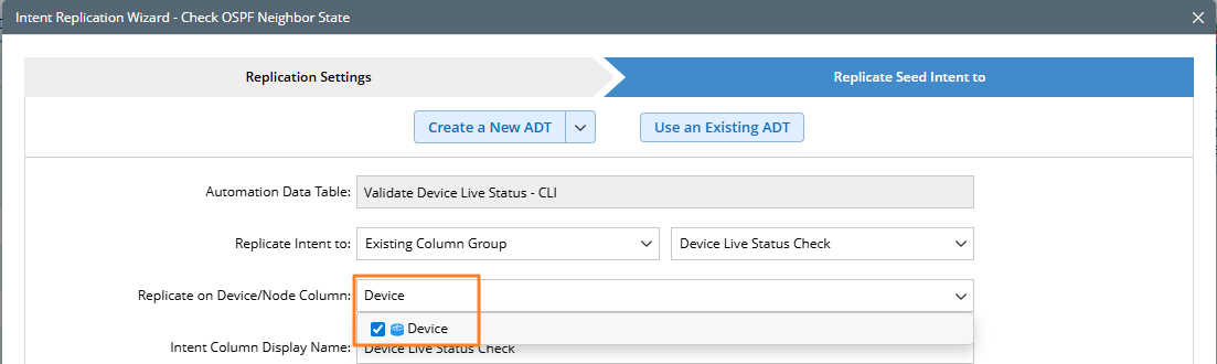 - In the Replicate on Device Column area, select the device column or device list column to replicate intent using the device properties in the selected column.