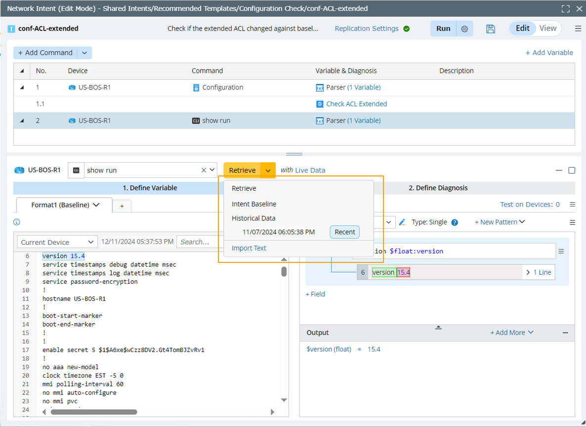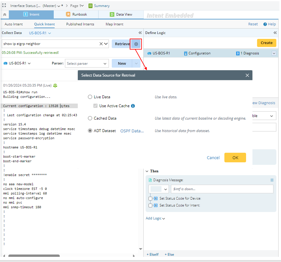 - Use dataset as the data source for creating intent via Quick Intent: When intent is created via quick intent, the first step is to retrieve data. Apart from live data and cached data, the system also supports using the ADT dataset as the data source for retrieving data (collect device configuration files or CLI commands) in Quick Intent. Live Data is the default option.