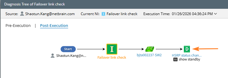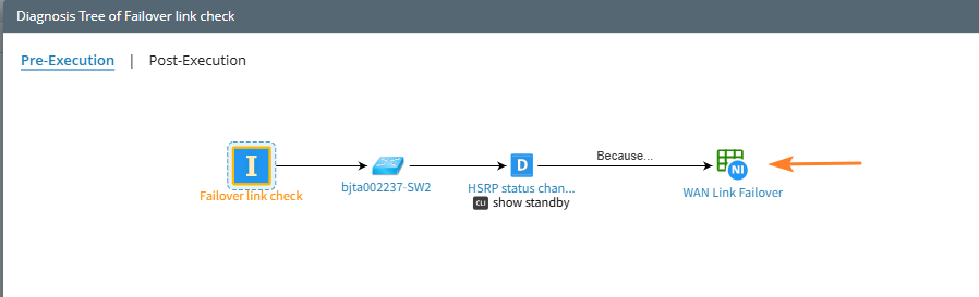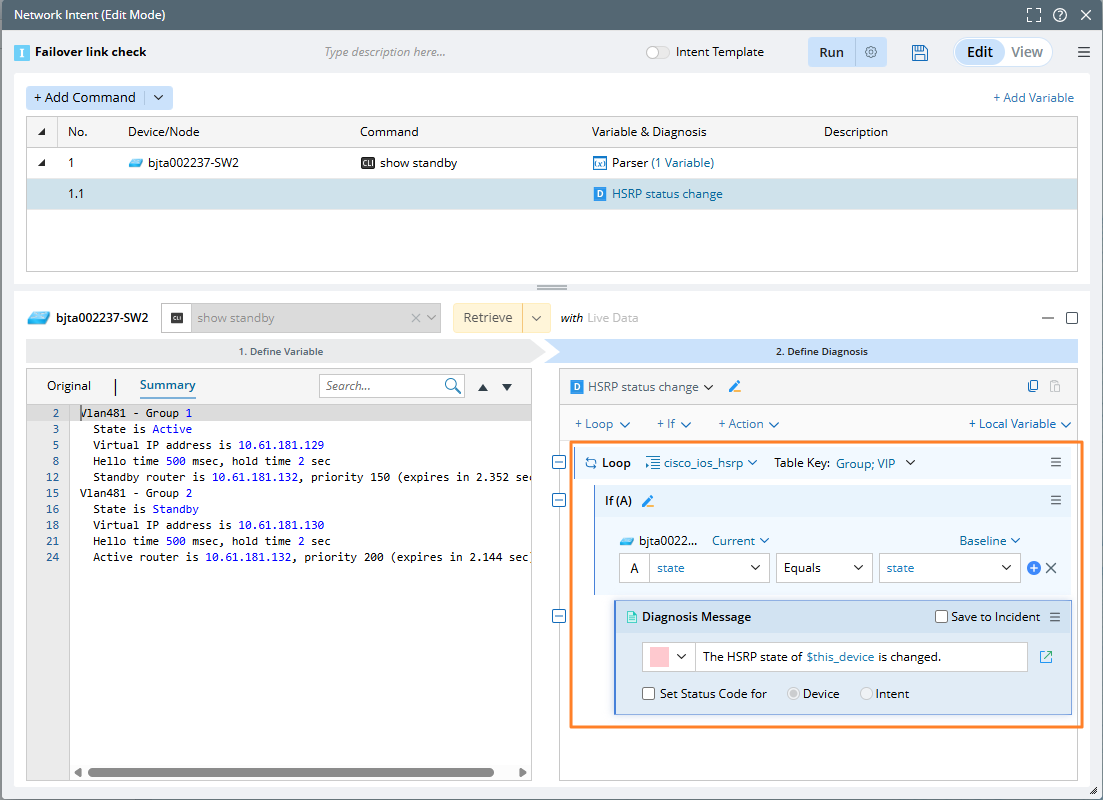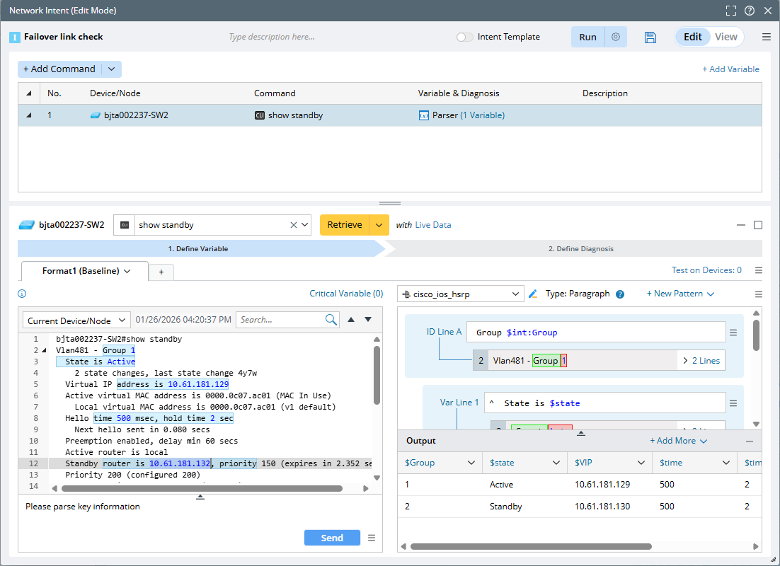 - Create a NI “Failover link check” and add CLI diagnosis for device “bjta002237-SW2”. Get a parsed table by command show standby.