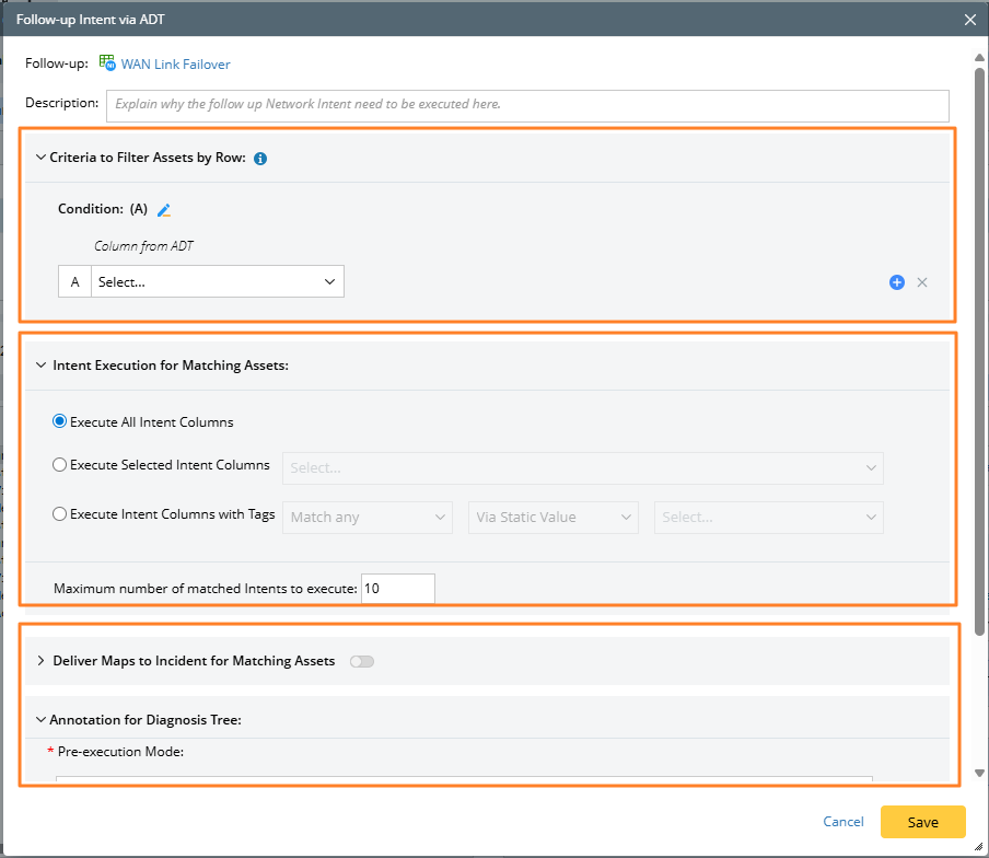 - Add a follow-up ADT intent node. Select the ADT “WAN Link Failover” and define the match conditions.