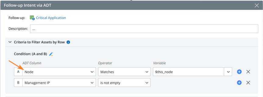 Note: You can use the Node column from ADT (Asset Data Table) to define conditions. If the Node column of ADT is selected on the left, only the Node type variable in NI is available on the right.
