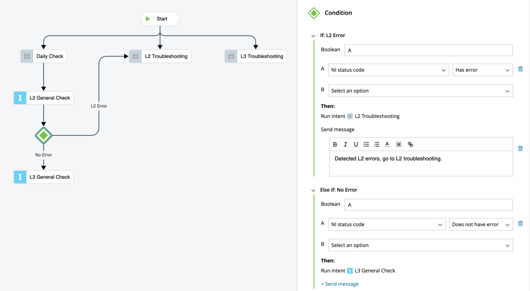- Define the condition node. If the NI status code has errors, then run the L2 Troubleshooting prompt node. If the NI status code does not have an error, then run L3 General Check intent.