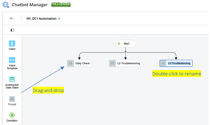 In this example, you can create a chatbot so end users can chat with the bot without accessing the NetBrain System and execute the pre-defined automation to ensure everything works as expected.