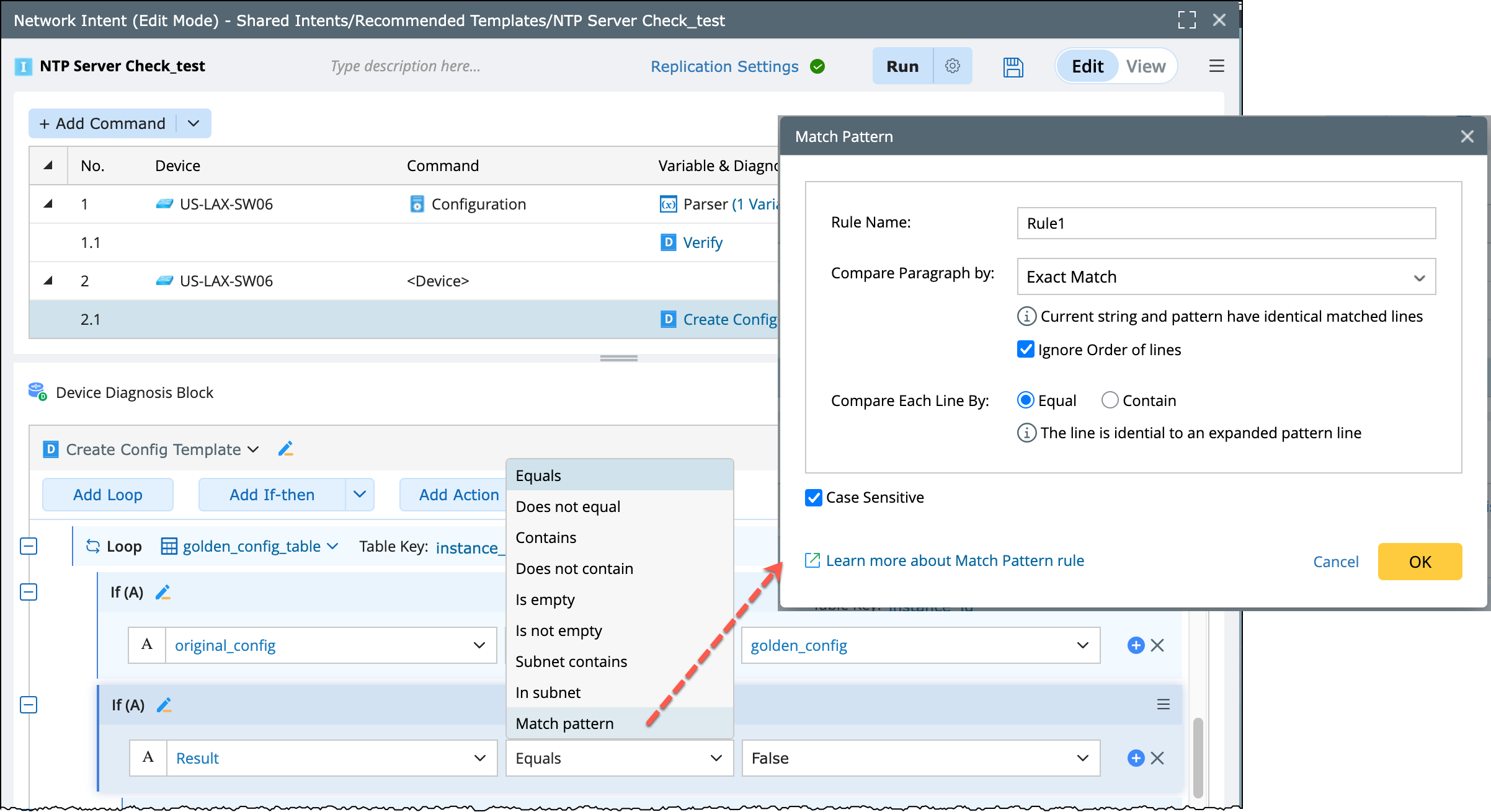 In intent diagnosis, when comparing the multi-line string of the device data with its last value/baseline value to detect changes, you can use the operator Match pattern. It can get comparison results, such as missing lines and extra lines. Furthermore, you can use such results in diagnosis message, CSV report, etc.