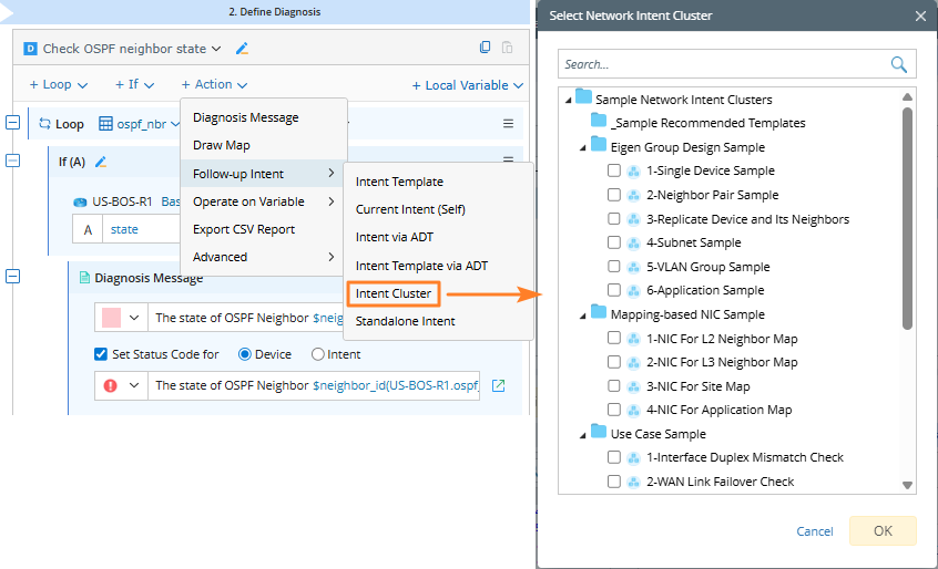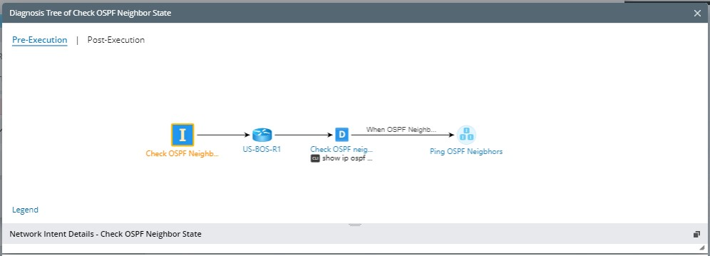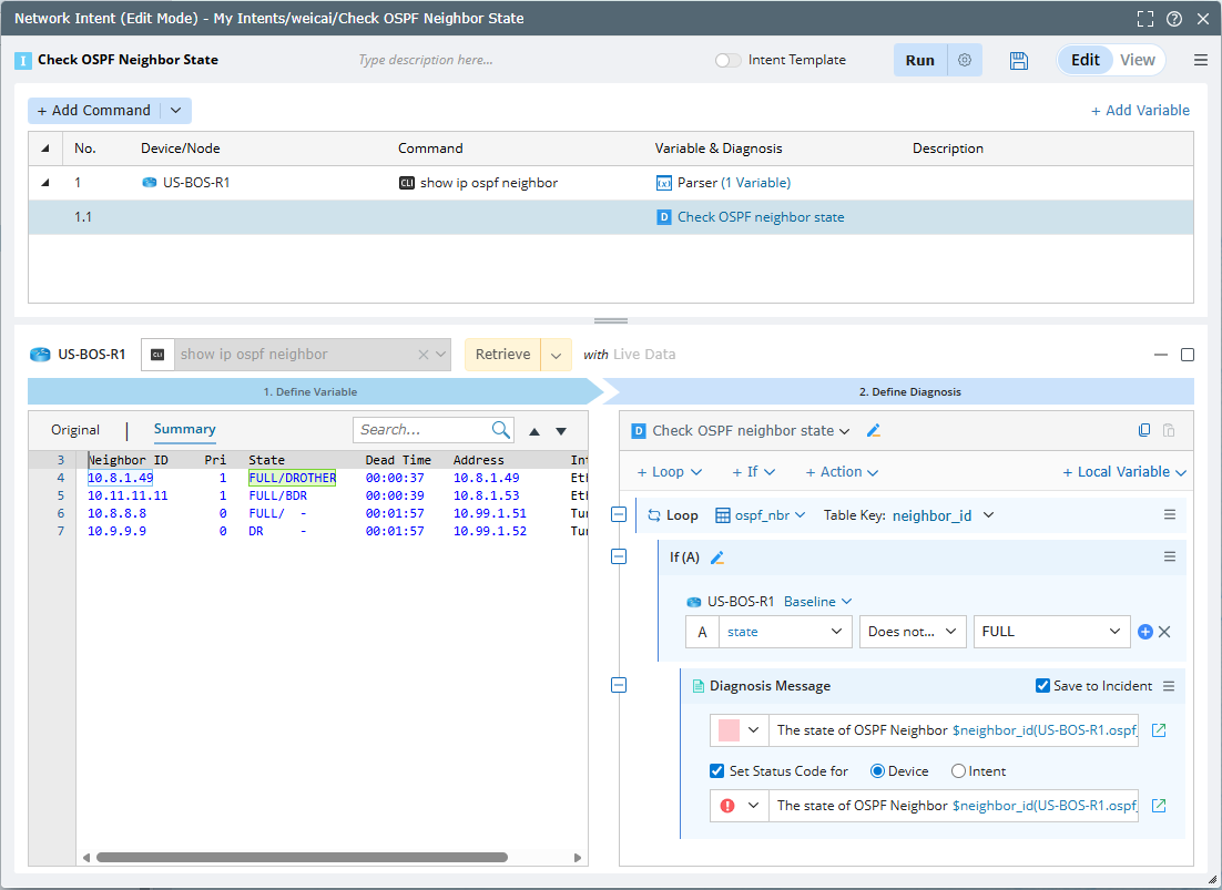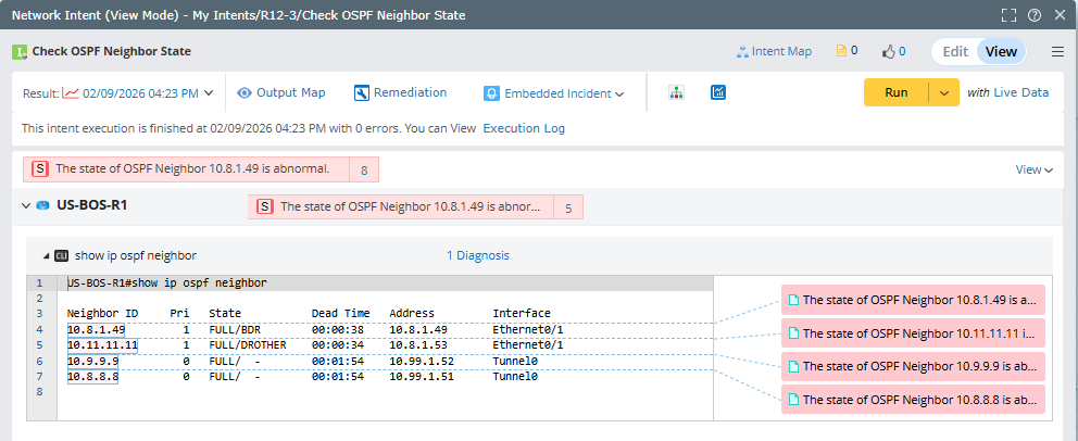 In real-world troubleshooting scenarios, a diagnosis usually has a follow-up diagnosis, and the follow-up diagnosis may take the output of the upstream diagnosis as the input. Users can use NIC as the follow-up diagnosis for this scenario by defining which member NIs of the follow-up NIC are executed via the output of the upstream NI. For example, for each entry changed in OSPF neighbors, uses can do a “Ping to state changed neighbor” in follow-up NIC with macro variable and pass the obtained value to command: ping $neighbor_ip.