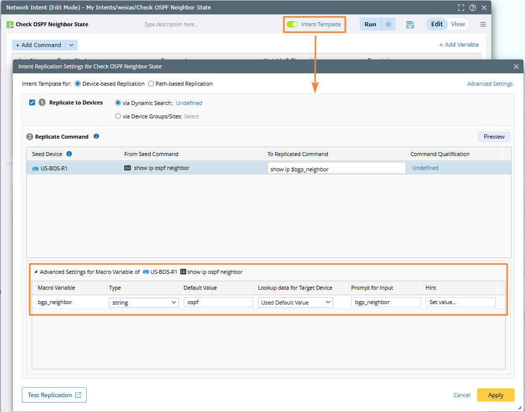 - In the NI Edit mode, enable the Intent Template and click it to Define Macro Variables to define the seed NI for NIC.