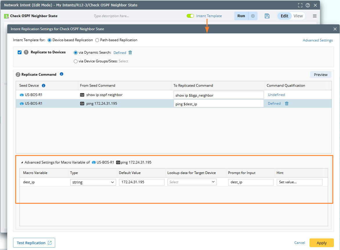 - Pass the variable bgp_nbr_ip to the macro variable in follow-up intent to ping.