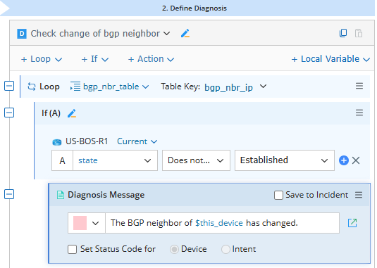 Complete the following intent to use follow-up NIT for further diagnosis, for example, ping BGP neighbors if the change is detected.
