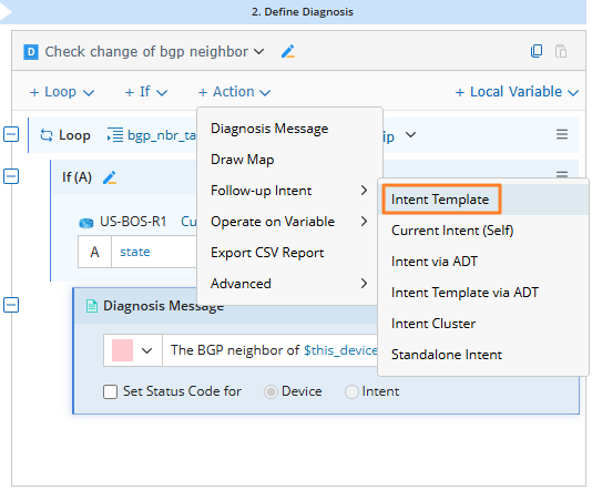 An intent (home intent) can call a specified cloned intent from intent template to run the follow-up diagnosis, under which the diagnosis logic in the template can be applied to downstream devices calculated from the home intent. The home intent can also transfer other variables to the macro variables of the follow-up intent templates.