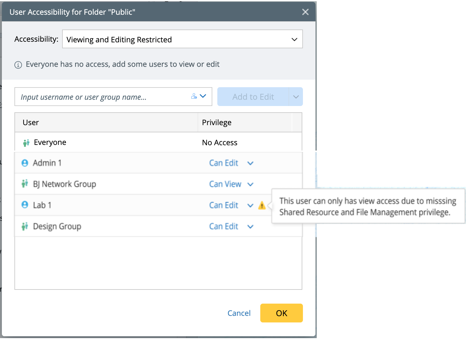 If a user in the group does not have the required shared privilege (for example, Shared Resource and File Management), they will be limited to View Only even if the group has Edit.