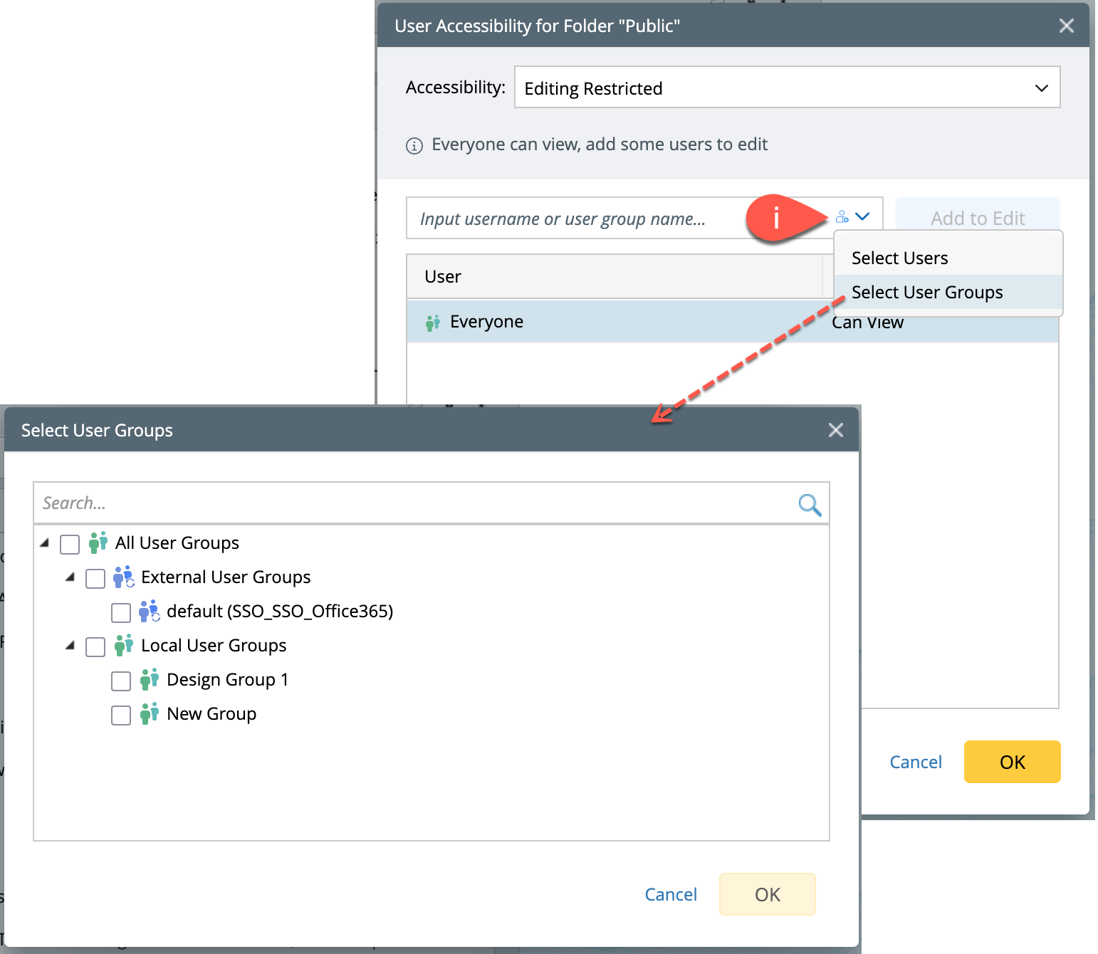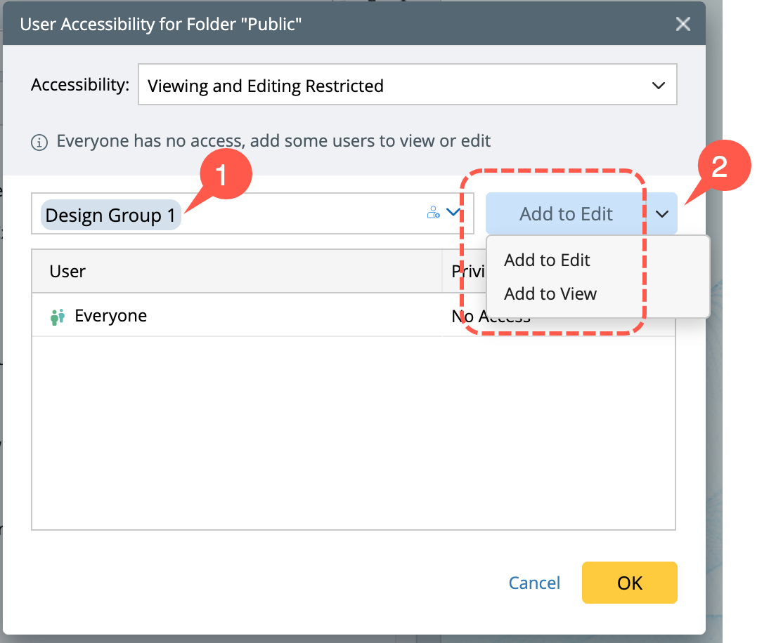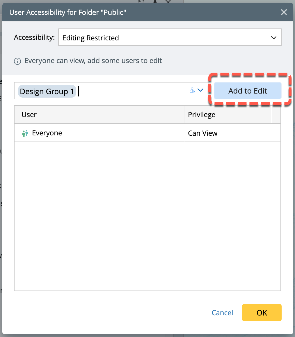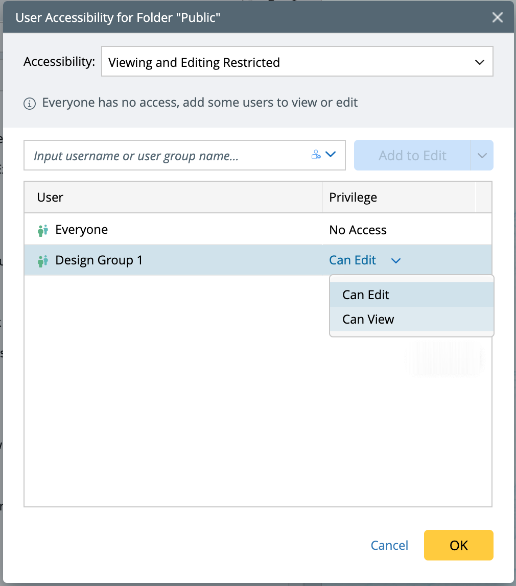 Changing Permissions: After adding, permissions can be modified at any time. You can switch a user or group from View to Edit, or vice versa.