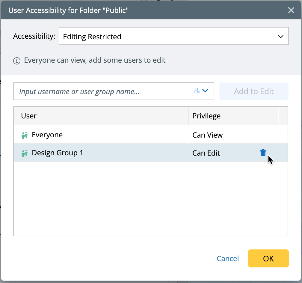 Removing Access: Hover over a user or group entry to remove their permissions.